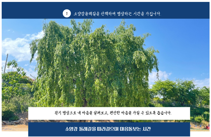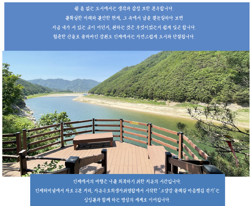 강원도 인제에서 소양강 둘레길을 둘러보시는건 어떨까요?인제 소양강 둘레길을 한바퀴 걸어보고 싱잉볼명상까지 함께 할 수 있어요.